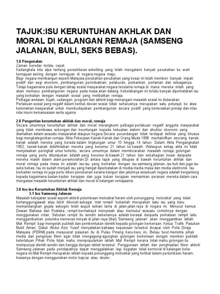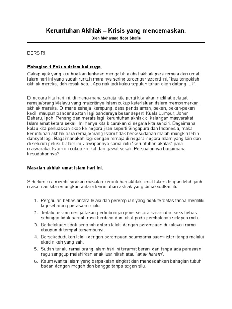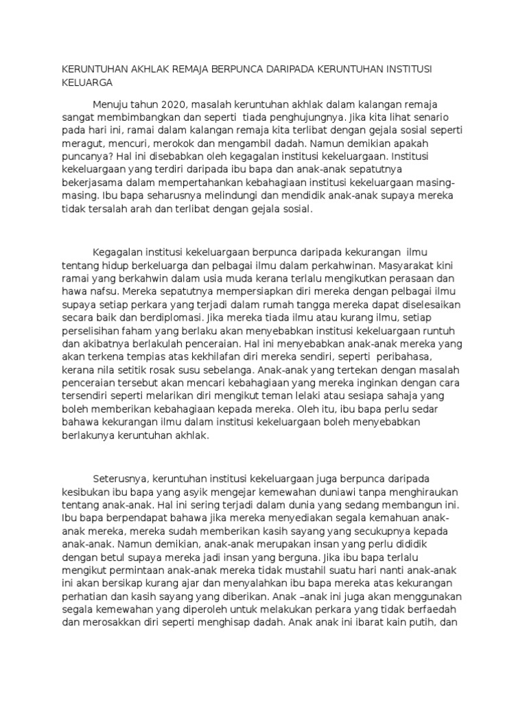 Keruntuhan Akhlak Remaja Berpunca Daripada Keruntuhan Institusi Keluarga from imgv2-1-f.scribdassets.com Namun begitu kesan yang paling ketara yang akan dilihat kiranya akhlak remaja pada hari ini tidak dikawal ialah: Untuk menangani gejala keruntuhan akhlak dalam kalangan remaja. Tidak dinafikan akhlak remaja pada hari ini sangat membimbangkan. Pada peringkat usia ini, mereka mempunyai perasaan ingin tahu yang sangat tinggi. Tidak dinafikan akhlak remaja pada hari ini sangat membimbangkan. Remaja merupakan aset utama negara pada masa akan datang, memainkan peranan yang sangat penting. Keruntuhan akhlak akan menyebabkan masyarakat menjadi hilang punca dan pertimbangan. Media memainkan peranan penting dalam perkembangan remaja yang boleh memberi kesan positif dan juga kesan negatif, media membantu dalam mendapatkan maklumat berguna yang berguna kepada kita, namun sebaliknya media juga boleh memberi kesan yang negatif.