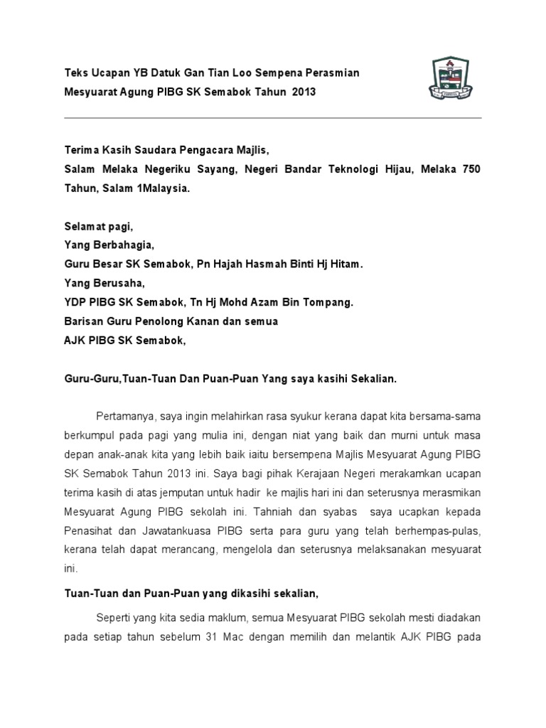 Teks Mesyuarat Agung Pibg Docx Document from demo.vdocuments.mx Mesyuarat agung pibg kali ke 29, 2014. Mesyuarat pibg kali ke 2. Text of surat perasmian mesyuarat agung pibg.docx. Mesyuarat agung pibg semarak 2017. Majlis perasmian program walkathon 2017. Teks majlis kuarter master teks ucapan majlis kuarter master. Mat nadzari bin ahmad dahlan, adun batang kali dan seterusnya merasmikan mesyuarat agung pibg sk batang kali kali ke 39 bagi. Ibu bapa haruslah peka dan membantu kepimpinan pibg supaya dapat mengwujudkan satu pasukan.